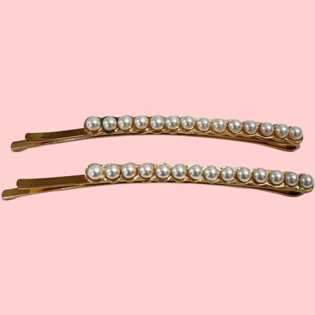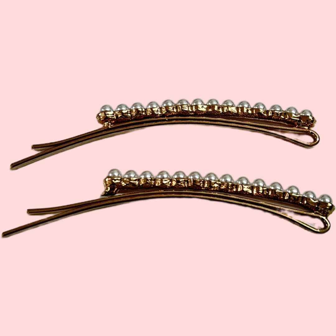 Guldfarvet hårclips med hvide perler.